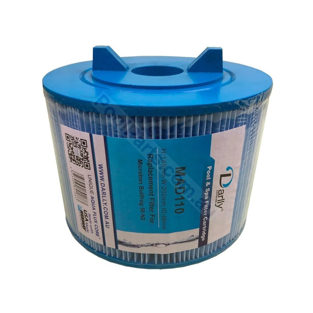 Microban® Open-Top Filter used with Nature 2 Cap & Nature 2 cartridge. XMF 50 BF, BU50, MSG50B (also replaces 25) filters for Bullfrog and other Spa Industries built Spas. 200mm wide x 150mm high. These use the high-quality Reemay or Darlly filtration material. These are not the cheap, poor-quality filters.