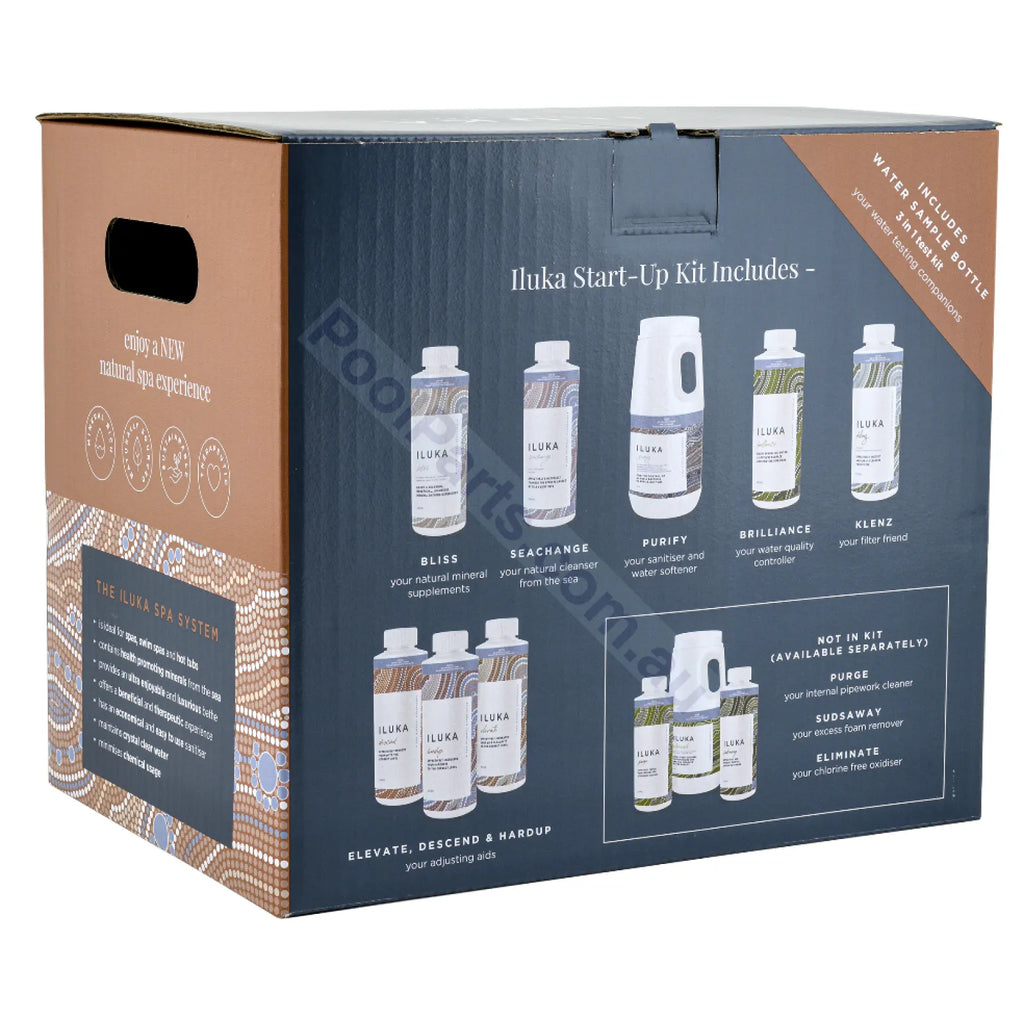 - Iluka Start-up Kit Includes - Bliss, Seachange, Purify, Brilliance, Klenz, Elevate, Descend, Hardup, 3 in 1 test strips, water sample bottle, 60ml Measuring Cup. We also recommend you add a 1kg Iluka Eliminate