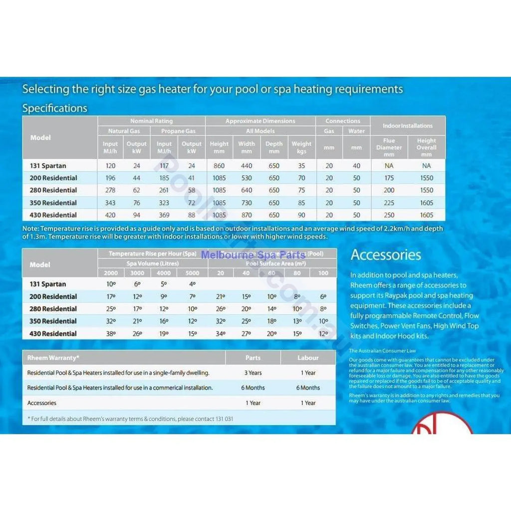 - We do not recommend the newer Raypak 280, 350, 430 gas heaters be installed where 40mm plumbing is used. Flow characteristics have changed in the newer heaters.