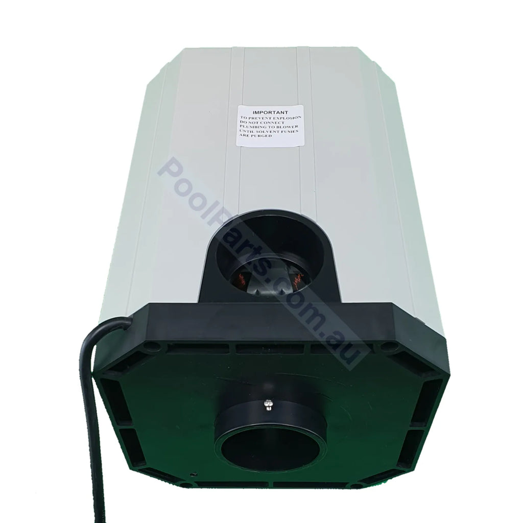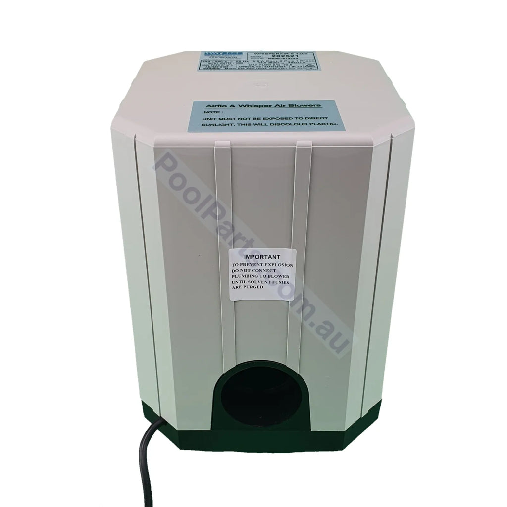 One of the quieter domestic spa air blowers (bubbler) on the market. Can be installed Outdoors, Indoors, or inside a spa. Comes with 50mm (60mm ID) ports on the bottom and side for various mounting positions. Comes with or without in-built air switch.